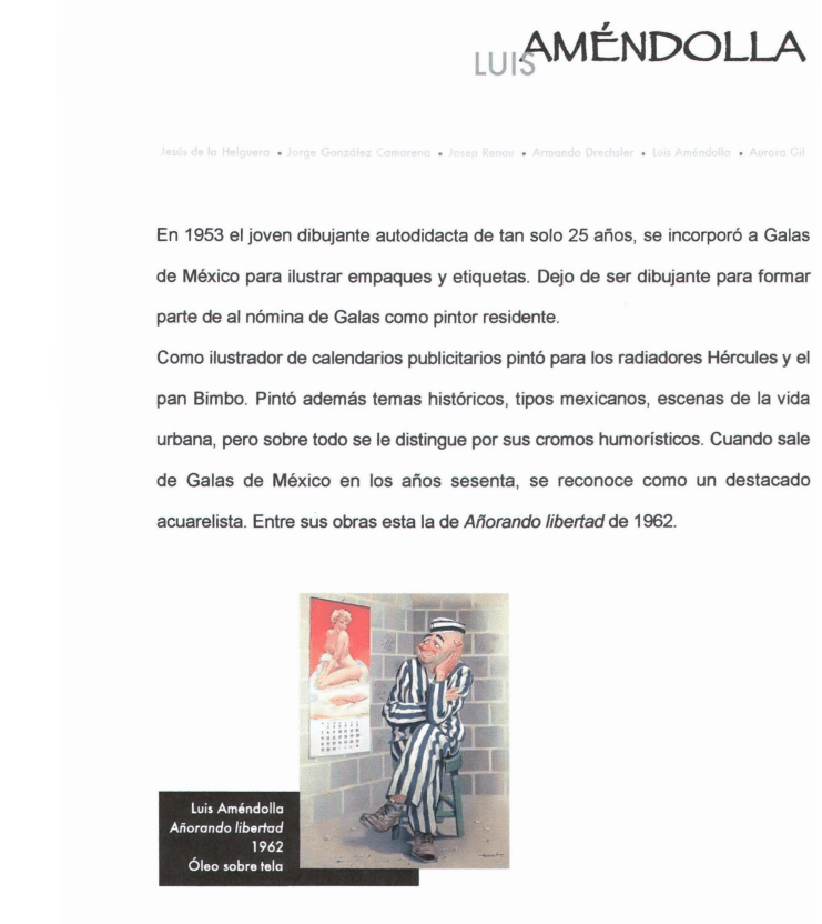 As an illustrator of advertising calendars, he painted for Hercules radiators and Bimbo bread. He also painted historical themes, Mexican characters, and scenes from urban life, but he was especially known for his humorous comic strips. When he left Galas de Mexico in the 1960s, he was recognized as an outstanding watercolorist. Among his works is “Anorando libertad” (Longing for Freedom) from 1962.