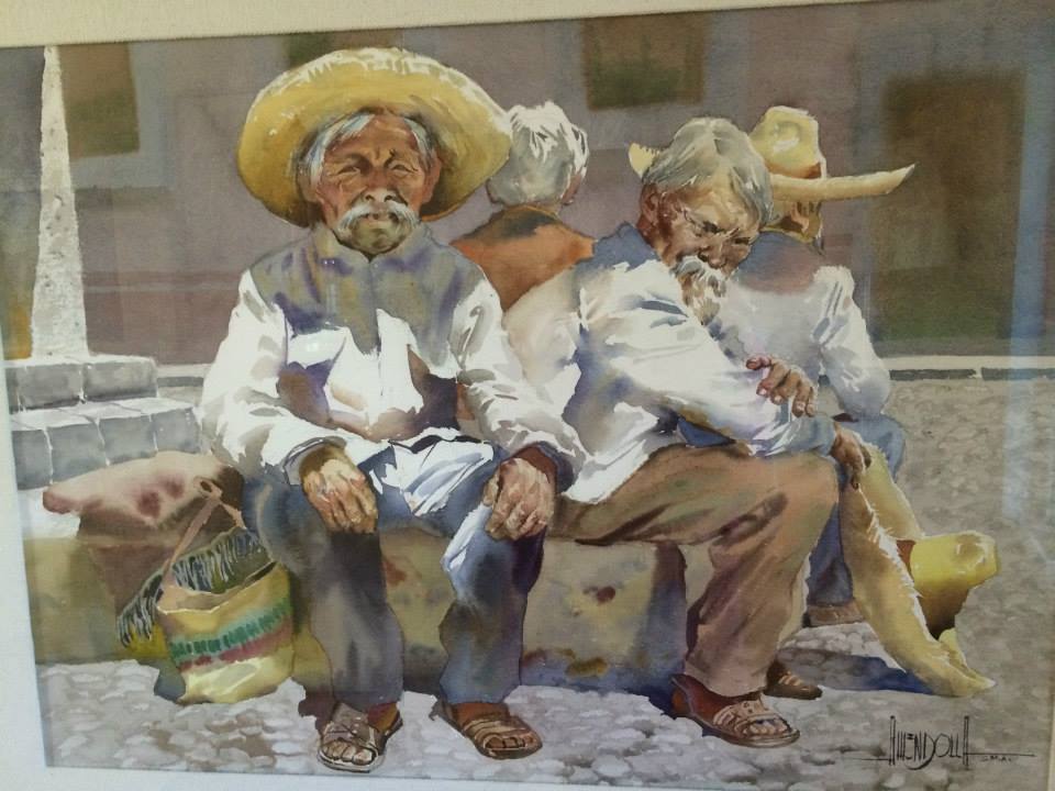 - the most detailed biography I could find was “Luis Ricardo Amendolla Gasparo, born on March 30, 1928 is considered one of the best watercolor painters of the Modern Era in Mexico. He achieved great status in the art world for his beautiful representations of landscapes and popular life where “El Tepozteco”, one of his most notable works, became the symbol of Tepoztlan. This place became so important to him that he lived there for many years. According to his wife Sara Celis, his personal staple was the people and places that represented Mexican culture, and it was his daughter Gloria who was to be his model. He was awarded for his work in Mexico and abroad. His artwork became known in New York, Houston, Los Angeles, Guatemala, Japan, Korea as well as Mexico. In his spare time he would draw cartoons satirizing himself. His friends described him as a “bohemian at heart” and great artist.”