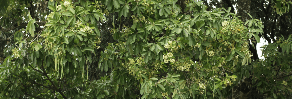 The kaduru tree, Alstonia scholaris is an evergreen tree in the oleander and frangipani family Apocynaceae. Its natural range is from Pakistan to China, and south to northern Australia. It is a toxic plant but is used traditionally for myriad diseases and complaints.