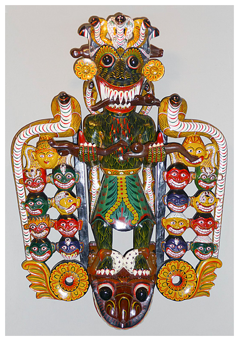 Maha Kola is the boss of 18 demons of illness that are represented in the Sanni “Devil” Dance. Holding victims in his hands and mouth, Maha Kola is surrounded by snakes and by the 18 Sanniyas – the demons of blindness, cholera, boils, and other pestilences, each of whom is given its own mask. As the curing ceremony proceeds, a ritual specialist propitiates the appropriate demons on behalf of the patient and his family. When done, the demons are dismissed and the area is ritually cleansed of any lingering bad influences