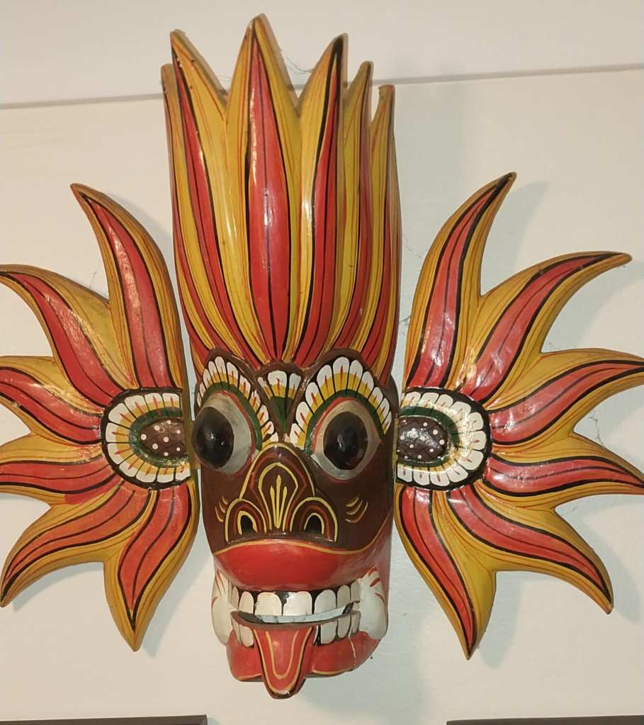 Hanging the mask in your home will work as a good luck charm and bring protection to your household. It is also said that having possession of this mask will “drown off” your enemies and, bring friendship and harmony. Other folklore says the Gini Raksha mask is representing the emotion of anger which is why it includes colours such as red, black, and white.