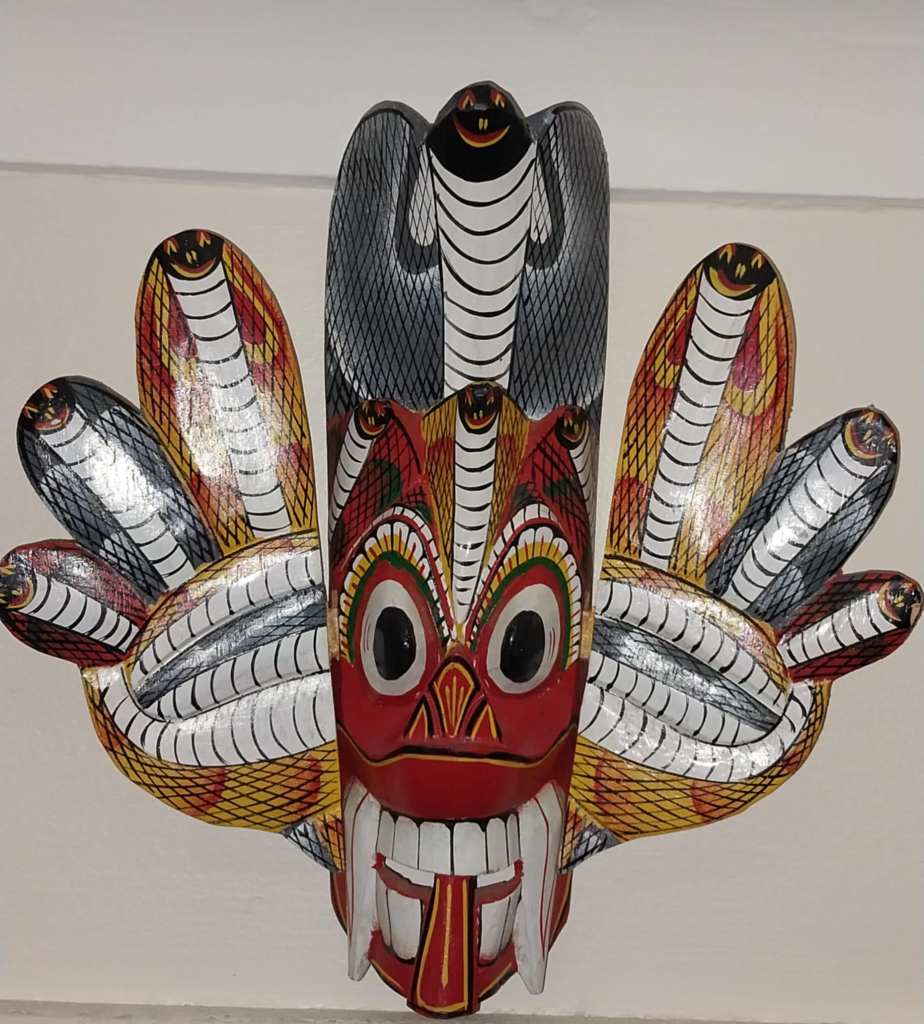 The ‘Naga Raksha’ (Demon King Cobra) mask, which is one of the most popular traditional Sri Lankan masks, is a blend of the Naga and a Raksha. The Naga (king cobra) is a commonly seen animal in ancient Sinhalese (one of the main ethnic groups of Sri Lanka) art. It is also a sacred animal as well as a feared animal in local mythology and folklore.