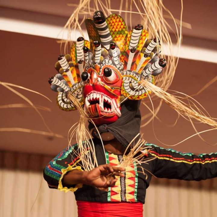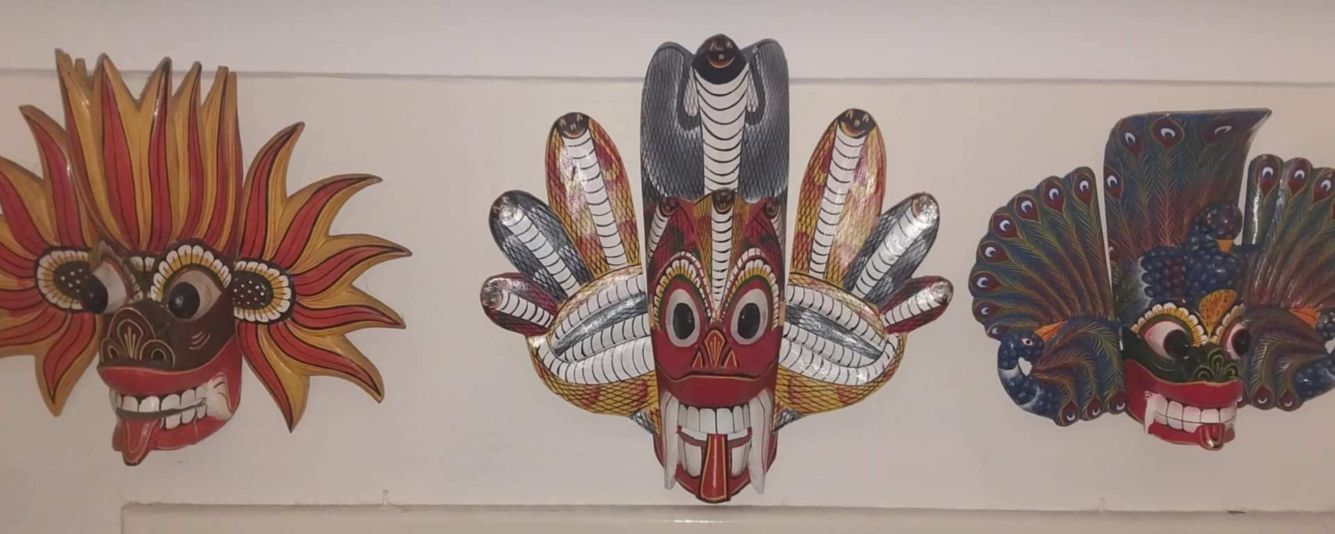 The Kolam masks are a tribute to the Rakshasas, a race that earlier ruled Sri Lanka and could assume 24 different forms. But only a few of these forms are performed, some of which are Naga Raksha (cobra mask), Gurulu Raksha (Mask of the Bird), Maru Raksha (Mask of the Demon of Death) and Purnaka Raksha.