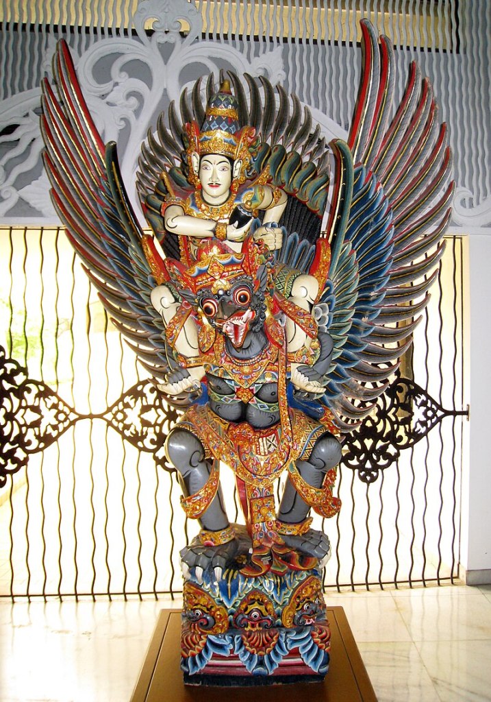 - Balinese wooden statue of Vishnu riding Garuda, Purna Bhakti Pertiwi Museum, Jakarta, Indonesia. – By Gunawan Kartapranata – Own work, CC BY-SA 3.0, https://commons.wikimedia.org/w/index.php?curid=11353849