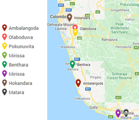 The Kolam drama was mainly popular in the maritime areas from Panadura to Tangalle, and suburbs in the interior of the country. Ambalangoda, Benthara, Mirissa, Matara, Rayigam korale olaboduwa, Hokandara, and Siyane Koralaye Gampaha..