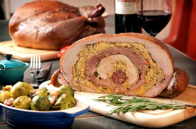 - A turducken is a cranberry & chestnut stuffing stuffed in a fully deboned whole free range chicken, stuffed inside a fully deboned whole free range duck, which is then stuffed inside a partially deboned whole free range turkey. Each slice contains portions of chicken, duck and turkey with cranberry and chestnut stuffing in between the layers.