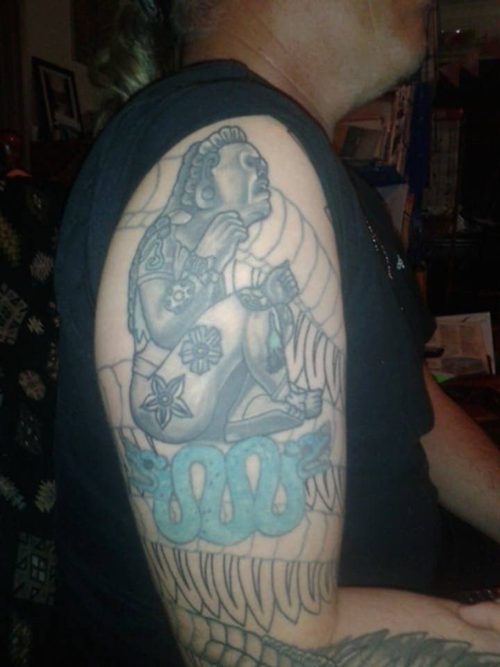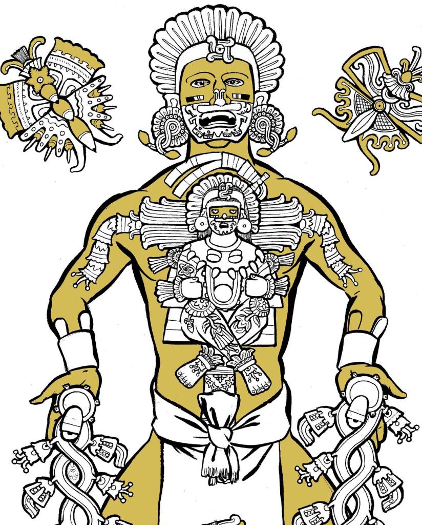 I have seen it noted that this version of Xochipilli is attired as a cuāuhocēlōtl or Eagle Warrior as he is wearing an eagle mask typical to this elite class of Soldier.