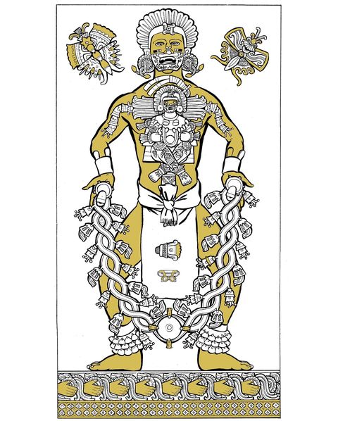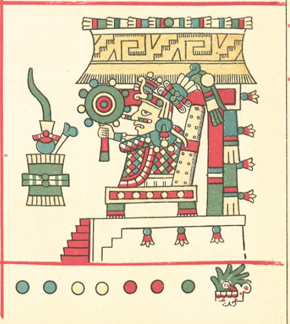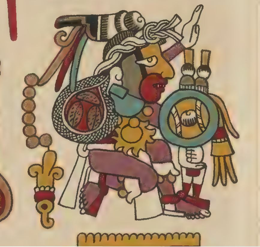 The character wears a maxtlatl or loincloth, carries jewels typical of the nobility such as wavy lines around the mouth, earmuffs, a necklace, and a shield with his arrow or dart.