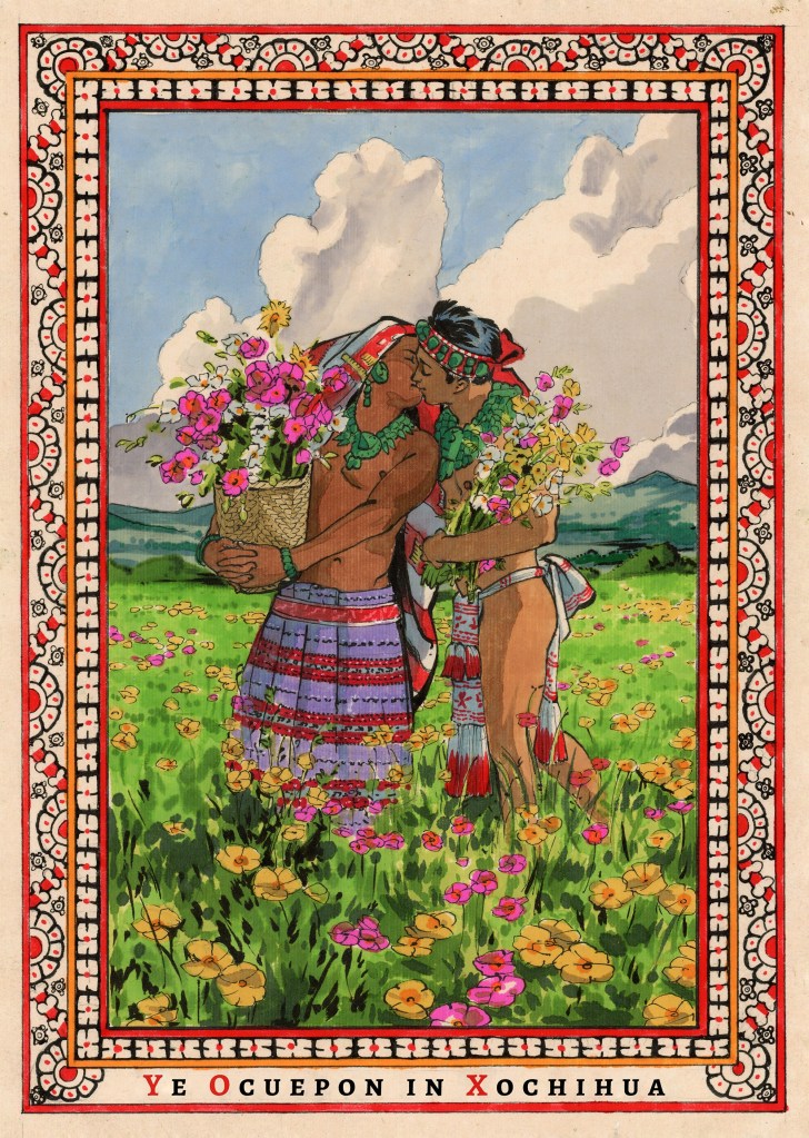 In ancient Nahua or “Aztec” culture, xochihua, owner of flowers, was the name given to queer people assigned (1) male at birth. For this culture, flowers were a sign of femininity, sexuality and beauty. To be an “owner of flowers” marked you as a person linked to the feminine realm of culture and being, and marked you as a third gender, neither male nor female but both. To our eyes xochihua people might appear similar to a trans woman, or a gender fluid person, encompassing elements of both genders. In this painting, a xochihua person carries a large basket full of flowers. They wear a skirt, and because of the heat, they have removed their huipil, or traditional blouse, and wear it covering their head. They exchange a kiss with their lover, a man. The phrase in the Nahuatl language, “Ye Ocuepon in Xochihua”, means “The Xochihua has Blossomed”.