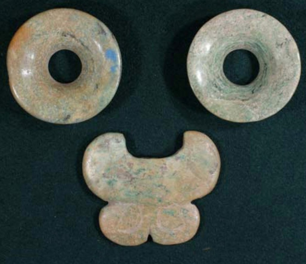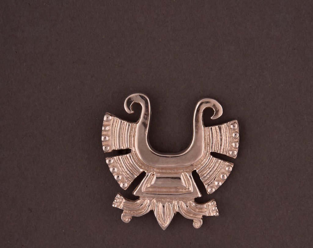 Archaeological examples of the yacapapalotl or nariguera (1) mariposa. INAH (Instituto Nacional de Antropología e Historia) notes that “These nose rings were given by the rulers to those warriors who distinguished themselves by their bravery and courage on the battlefield. This ornament, achieved through the techniques of lamination and embossing, represents the wings of the insect in a very stylized way.”