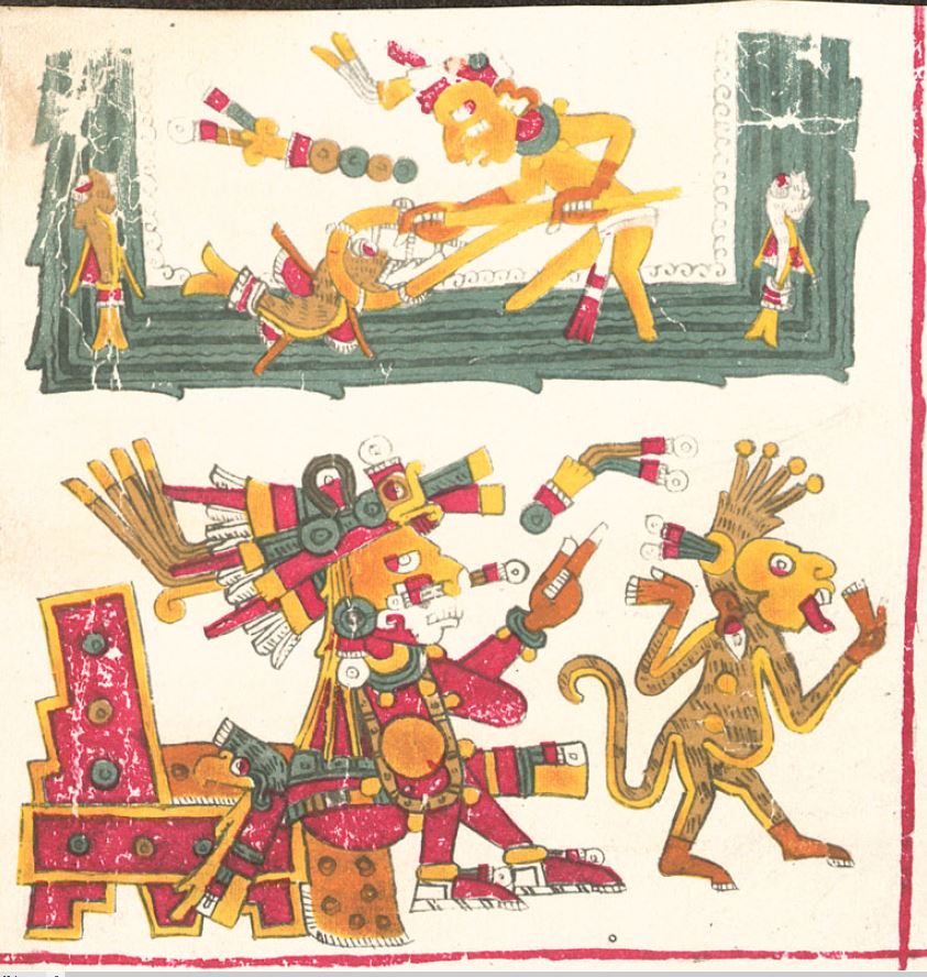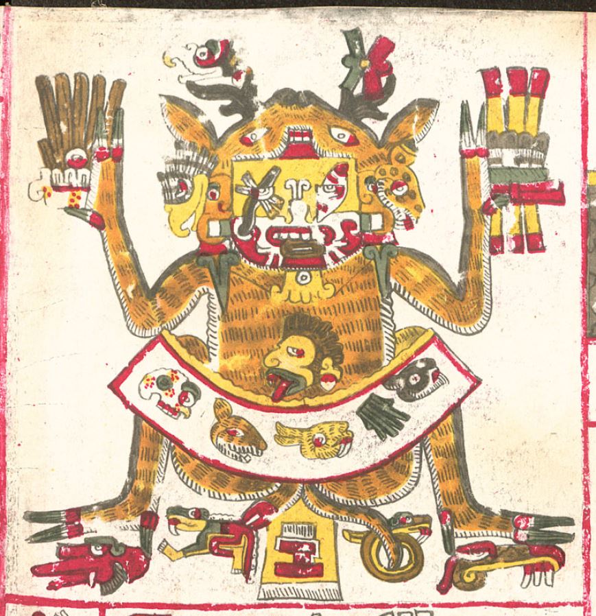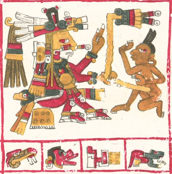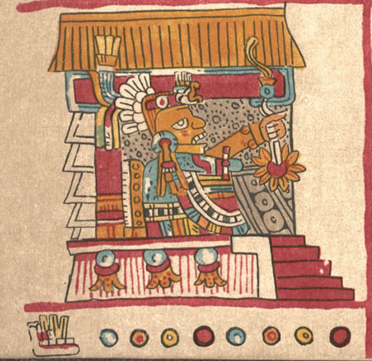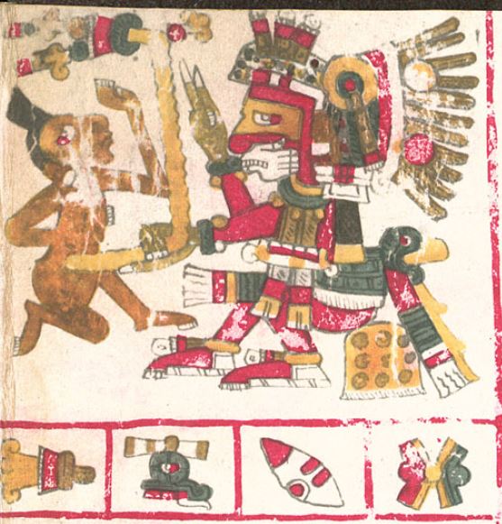 Xochipilli in the guise of Macuilcoatl (Five serpent macuil – five : coatl – serpent), one of the Ahuiateteo or Macuiltonaleque, or “lords of the five souls” (macuil, “five” + tonalli, “soul”) which embodied the dangers and consequences of overindulgence, including excessive drinking, gambling, and sex.