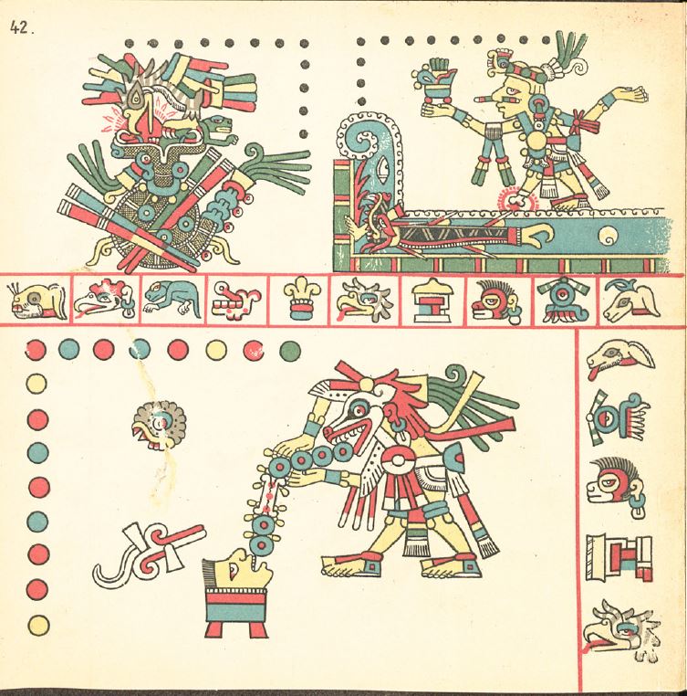42) When Quetzalcoatl was now happy, he said: “Go and bring my older sister Quetzalpétlatl; let us both get drunk.” His pages went to Nono hualcatépec, where she was doing penance, to tell her: “Lady, my daughter, Quetzalpétlatl, fasting woman, we have come to take you. The priest Quetzalcoatl awaits you. You are to be with him.” She said: “It is a good time. Let us go, grandfather and page.” And when he came to sit beside Quetzalcoatl, they gave him four rations of pulque and one more, his libation, the fifth. Ihuimécatl and Toltécatl, the drunkards, to also give music to Quetzalcoatl’s eldest sister, sang: