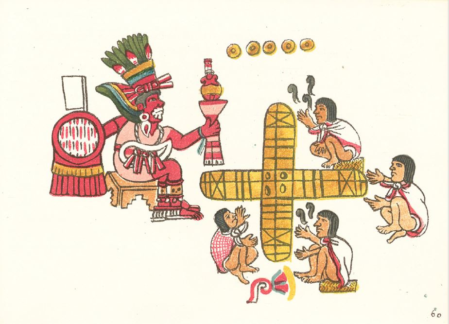 The number 5 in this case references the “fifth cup” which symbolised overindulgence and the descent into inebriation. Drunkenness was frowned upon in Aztec society (particularly by the Mexica). Public drunkenness was punished by a beating and repeat infractions (except by the elderly who were generally exempt from the rule) could even result in death. The fifth cup involved the drinking of octli (or pulque), four cups was considered allowable but the fifth cup was the one that intoxicated. This goes back to the legend of Quetzalcoatl who was tricked into drinking a fifth cup of pulque which resulted in his drunkenness and having sexual relations with his sister; the shame of which resulted in him abandoning his people.
