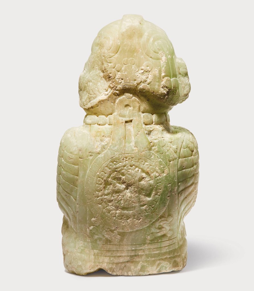 Aztec Diety Image of Xochipilli-Macuilxochitl, Late Postclassic, ca. A.D. 1450-1521. Light-green aragonite (Mexican onyx marble-tecali), height 12in (30.5cm); width 5 3/4in (19cm)