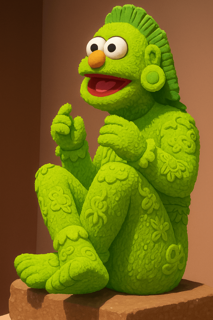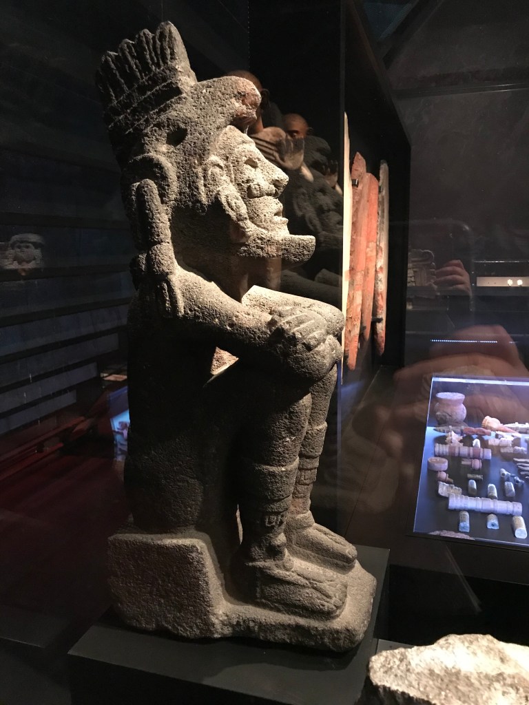 - Visitor in front of the statue of Xochipilli, the Aztec god of music – https://musikschulwelt.de/archiv/7062-musikwelten-in-mannheim