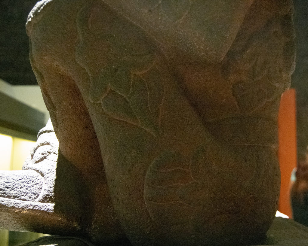 The most characteristic feature identifying the statue as Macuilxóchitl is the mouth paint that represents the palm of a hand.