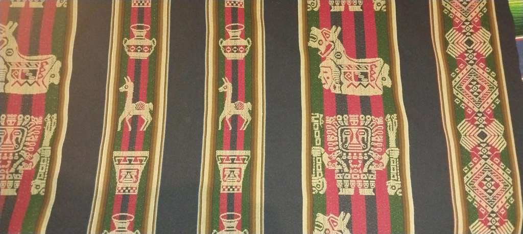 This piece of cloth (a little over 2 metres long) was found by a friend in a thrift store in Western Australia. She picked it up for me as it looked vaguely “Mexican” to her. Viracocha (1) is part of the recurring pattern. It is also quite thin but incredibly warm.