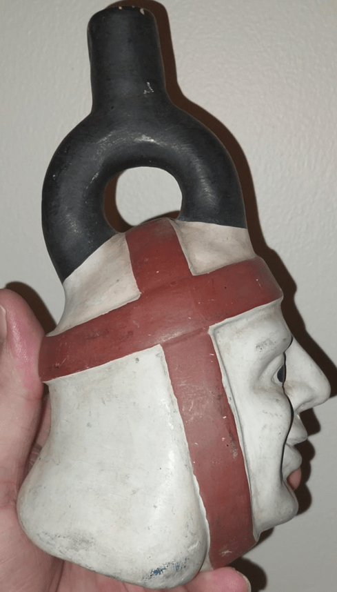 This is known as a portrait “stirrup” (1) bottle popular in the Moche culture (2). These high-status, finely crafted bottles were made using moulds and hand-finishing techniques, showcasing a glossy surface and often depicting portraits of real individuals, possibly warriors or elites, who were central to Moche society and belief systems.