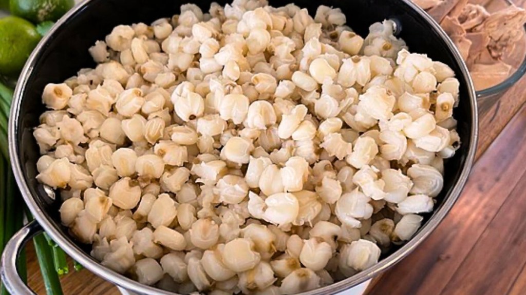 A Mexican Government website notes in an article on pozole not that the water foams up during cooking due to something in the corn that makes the water foam, but relates it to the physical structure of the corn itself. Think popcorn (but popped in a soup)