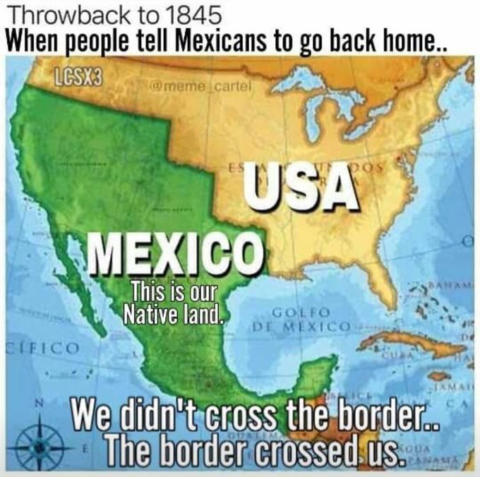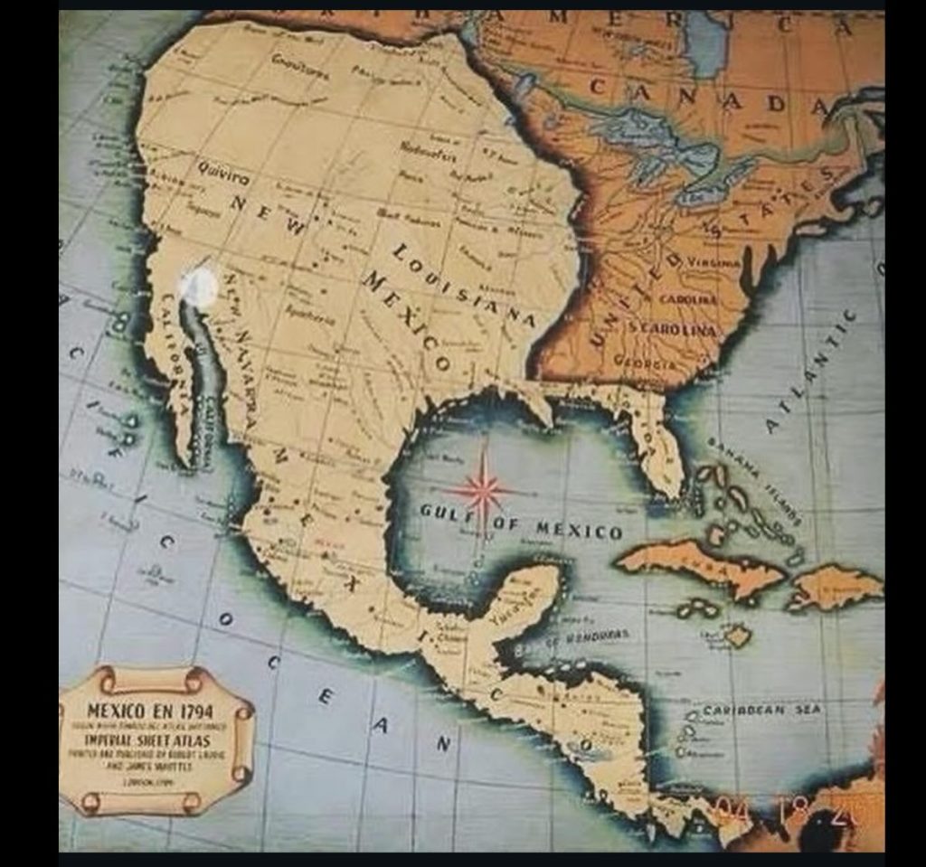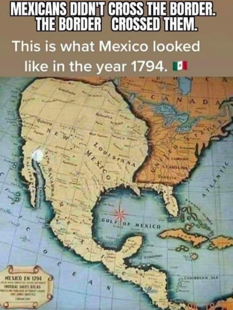 Map 1 : 1794 : is often used in reference to being “crossed by the border” but, as has been pointed out, “Mexico was not an independent nation at the time of this map. It declared independence on September 28, 1821, and it wasn’t even recognized by Spain until 1836. France administered most of the map (you cite) until the US purchased the Louisiana territories from Napoleon in 1803, (which is shown in Map 3). Spain administered the rest until 1821 at the earliest. Santa Anna ceded Texas in 1836, the independent nation of Mexico controlled their Northern territories for a grand total of 27 years (if we are to be generous)”, regardless of this statement the United States of America did not own the land (irregardless of its current owners being called “Mexico” or not) and they seized it by war.