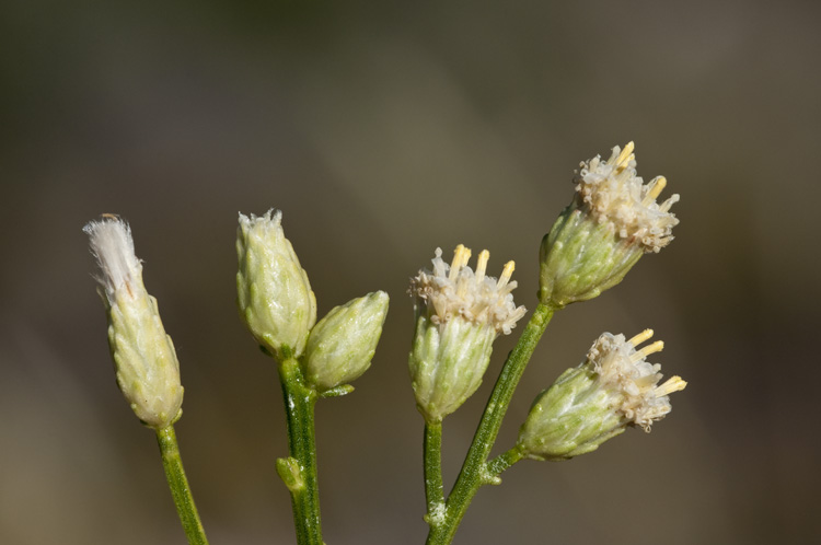 Baccharis sarothroides is a North American species of flowering shrub known by the common names broom baccharis, desertbroom, greasewood, rosin-bush and groundsel in English and “escoba amarga” or “romerillo” in Spanish. This is a spreading, woody shrub usually sticky with glandular secretions along the primarily leafless green stems. The small, thick leaves are a few centimeters long and are absent much of the year, giving the shrub a spindly, twiggy appearance. It flowers abundantly with tiny green blooms on separate male and female plants. In late summer the female flowers produce large amounts of seed in flamboyant fluffy white seed heads. The immature male flowers bear a resemblance to the flowers of the Porophyllums so I can see how these plants (at certain stages) might be confuse for one another.