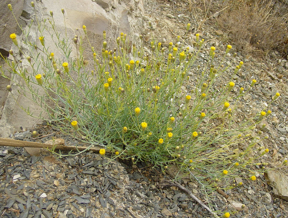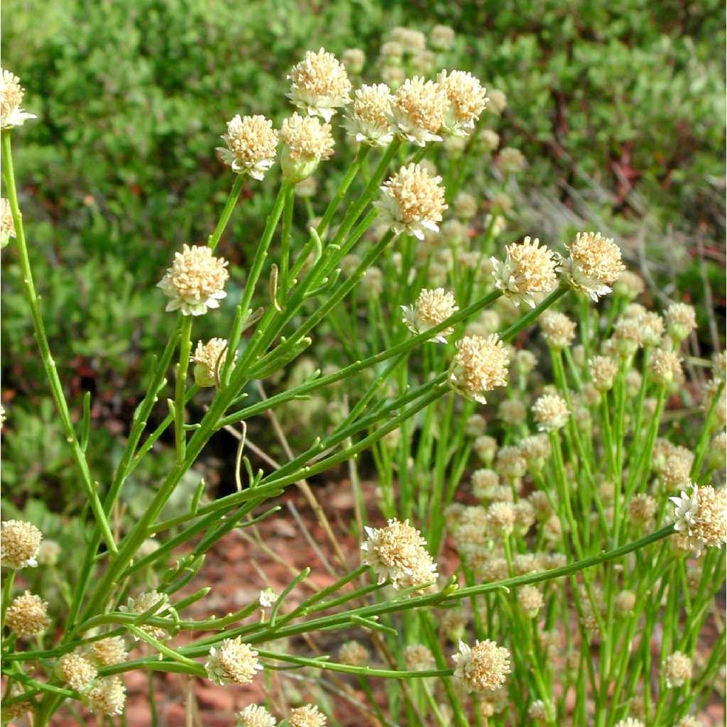Trans-pecos pore leaf is a shrubby perennial which grows to about two feet (60cm) tall. A few thread-like leaves grow along the stem, but often this plant, when out of bloom, could be mistaken for a small desert broom or Mormon tea. The rayless yellow blossoms appear mostly after rains and attract a wide diversity of pollinators.
