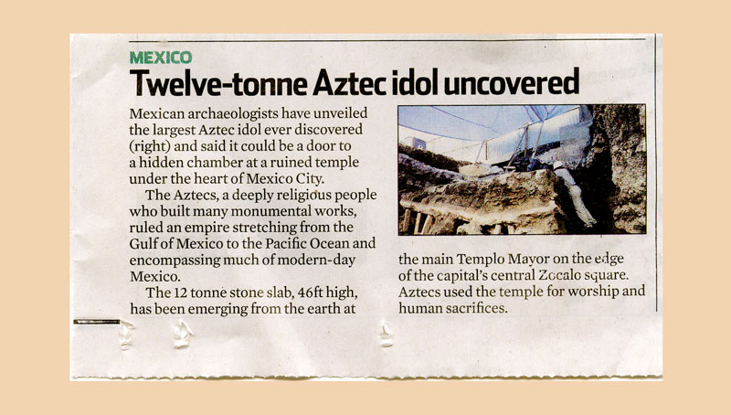 Cover Image : Article from The Observer, Sunday 15th. October 2006 referencing the discovery of the Tlaltecuhtli monolith (more on this later) Under the streets of México City Tenochtitlan lies sleeping. México City was constructed upon the ruins of Tenochtitlan and from the very bones of Tenochtitlan itself. The temples were pulled apart and used to construct the palaces and churches and, in some cases, … Continue reading Ciudad de México: Bajo Las Calles
